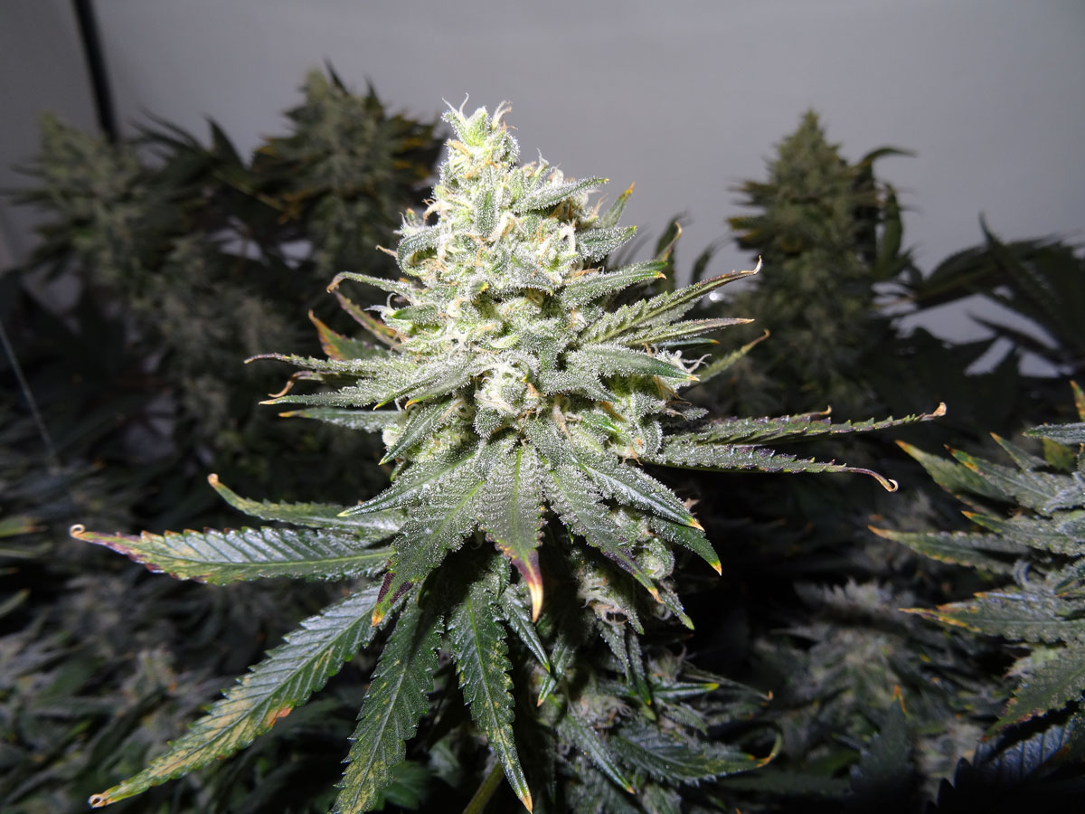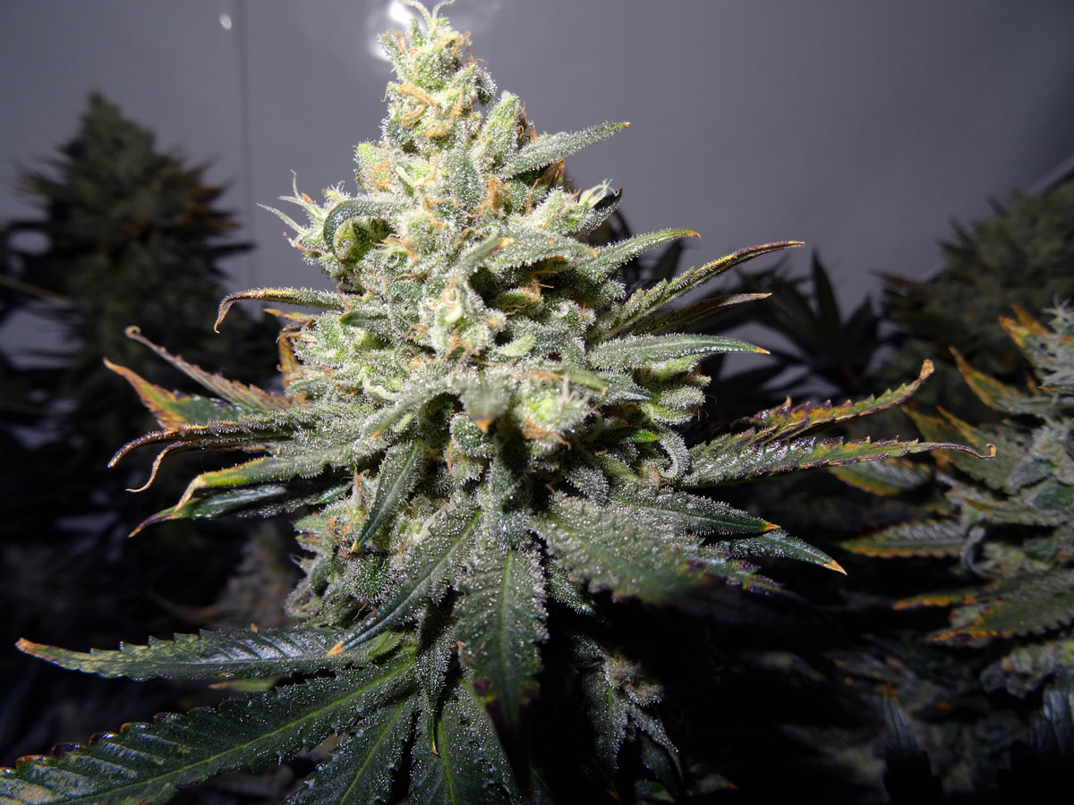 А вот та же самая кола через неделю. Она не только успела достигнуть зрелости, но и конкретно прибавила в весе. Почти все волоски теперь потемнели и изогнулись, а трихомы помутнели.